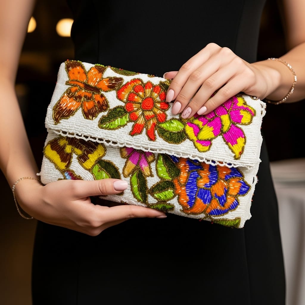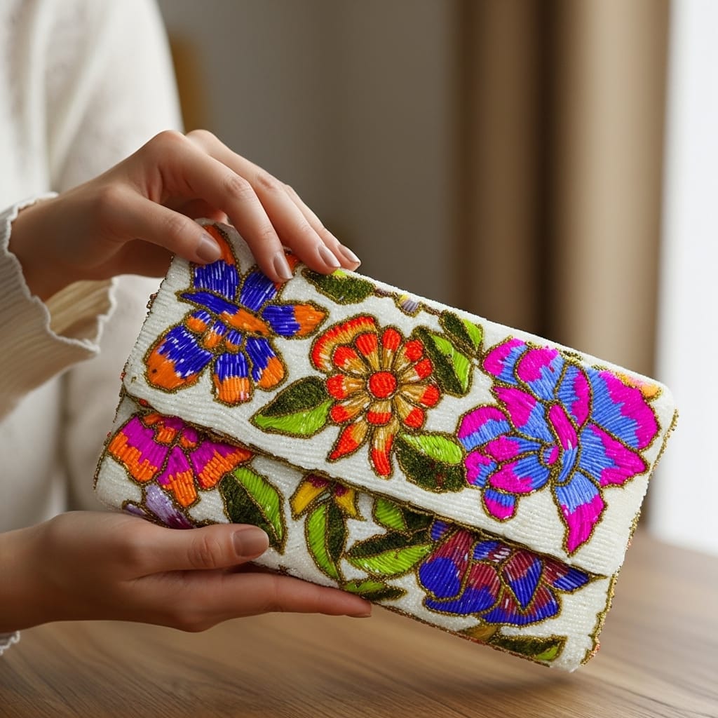 Inspired by the timeless beauty of the Taj, the Taj Bloom clutch celebrates elegance, grace, and craftsmanship. Each piece is handmade with intricate beadwork, forming delicate floral patterns that reflect royal artistry and modern sophistication.